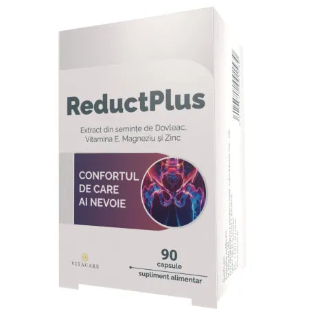 Asocierea sterolilor continuti in extractele vegetale cu zincul si vitamina E pot asigura o functionare optima a prostatei, prin scaderea concentratiei de dihidrotestosteron DHT. Inhiba multiplicarea celulara si are ca rezultat scaderea volumului prostatic si simptomatologiei asociate. Sterolii si triterpenele continute in Pygeum Africanum pot avea actiune antiinflamatoare; de asemenea, aceasta planta este un excelent antibiotic natural. Extractul din Pygeum Africanum este un tonifiant al glandelor masculine. Palmierul pitic (Serenoa repens) este o sursa naturala de fitosteroli cu efecte benefice asupra functiilor prostatei. Poate reduce inflamatia, durerea si volumul rezidual. Extractul din seminte de dovleac este binecunoscut pentru imbunatatirea fluxului urinar. Vitamina E reprezinta un complex de antioxidanti care anihileaza radicalii liberi la nivelul prostatei. Tonifica prostata. Zincul joaca un rol important in funcţia de reproducere a barbatilor. Participa la secretia hormonului sexual masculin, la sinteza testosteronului, fiind benefic si in prevenirea hipertrofiei de prostata. Zincul impreuna cu magneziul si vitamina E au un puternic efect antioxidant si de indepartare a radicalilor liberi, avand un important rol in prevenirea cancerului de prostata. Reduct Plus este recomandat ca adjuvant in hipertrofia prostatica benigna, pentru reducerea manifestarilor functionale neplacute ale adenomului de prostata (poliurie, disurie), prostatite bacteriene si nebacteriene. Poate prezenta rezultate favorabile in fazele incipiente ale cancerului de prostata.