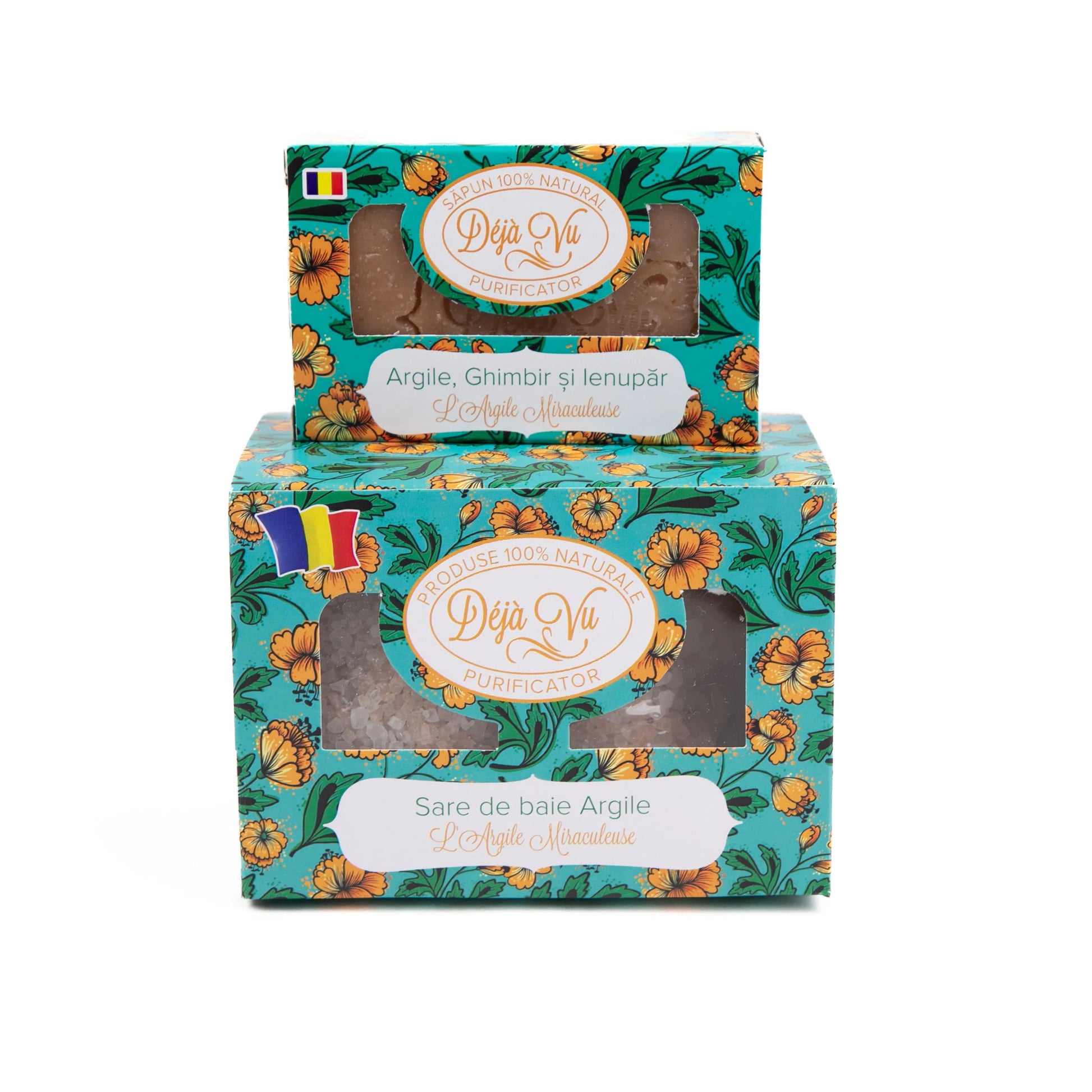 imbunatatiti-va rutina de ingrijire personala cu acest set special, care include sare de baie si sapun natural cu argila, ghimbir si ienupar.