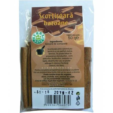 Scortisoara Batoane, 50g, HERBAVIT - Produs natural sanatos Scorţişoarabatoane are o aromă puternică cu un parfum dulce, lemnos. Se poate folosi la prepararea dulcețurilor , compoturilor, budincilor, orezului cu lapte, deserturilor sau se poate adăuga în băuturi fierbinţi (ceaiuri, vin...