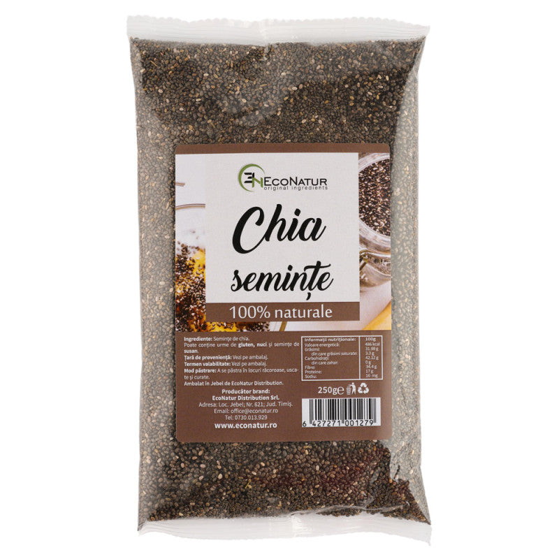 Semintele de Chia sunt considerate un super-aliment si reprezinta o sursa excelenta de fibre. Sunt bogate in proteine, acizi grasi esentiali Omega-3 si Omega-6, antioxidanti, aminoacizi, vitamine si minerale.Ingrediente: Seminţe de chia. Poate contìne urme de gluten, nuci şi seminte...