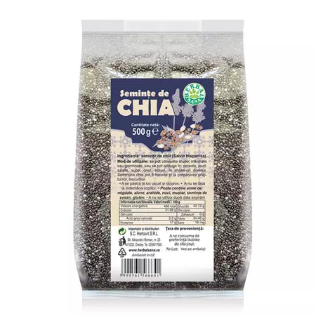 Seminte de chia, 500 g, Herbal Sana Descriere: Semințele de chia (Salvia Hispanica) sunt recunoscute pentru conținutul ridicat de fibre, proteine, acizi grași Omega-3 și antioxidanți. Acestea sunt o sursă excelentă de energie și nutrienți esențiali pentru o dietă echilibrată Proprietăți:...