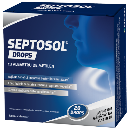 SEPTOSOL DROPS include un amestec de uleiuri esenţiale care, impreuna cu extractul de Echinacea si flori de Soc, acţioneaza sinergic asupra tractului respirator superior, menţinand buna funcţionare a acestuia. Aroma placuta a uleiurilor esenţiale se imbina cu extractul din flori de Soc pentru a spori beneficiile si a conferi un plus de aroma si a improspata respiraţia.