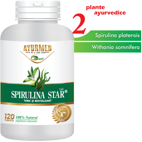 Cele mai multe dintre dezechilibrele organismului apar ca urmare a nerespectarii unor principii de viata sanatoase. Organismul uman poate fi comparat cu o constructie. Prin rutina zilnica contribuim fie la consolidarea sa, fie ii slabim structura. SPIRULINA STAR este un supliment alimentar ayurvedic care contine o combinatie originala de Spirulina plantensis si Withania somnifera care, datorita continutului bogat de vitamine, minerale, aminoacizi si enzime ajuta la revigorarea si functionarea optima a organismului. SPIRULINA STAR ajuta la mentinerea capacitatii organismului de a rezista in conditii de efort fizic si psihic intens, in conditiile stresante din mediul cotidian. Fitonutrientii neutralizeaza radicalii liberi, asigurand protectia organismului de stresul oxidativ si de procesele degenerative si contribuie la echilibrarea sistemului imunitar si la mentinerea capacitatii de autoaparare a organismului. Pastreaza tineretea si vitalitatea organismului si sustine incetinirea procesului de imbatranire. De asemenea, sunt sustinute procesele de detoxifiere si eliminare a deseurilor metabolice si toxinelor din organism. SPIRULINA STAR, prin aportul bogat de proteine, vitamine si minerale completeaza nevoile nutritive si energetice ale persoanelor care au un regim alimentar special (hipocaloric, vegetarian, tineri si varstnici), pentru mentinerea energiei si rezistentei organismului, redand vitalitatea acestuia. Este recomandata in perioadele de refacere dupa diverse afectiuni, in cursul si dupa radioterapie si chimioterapie.