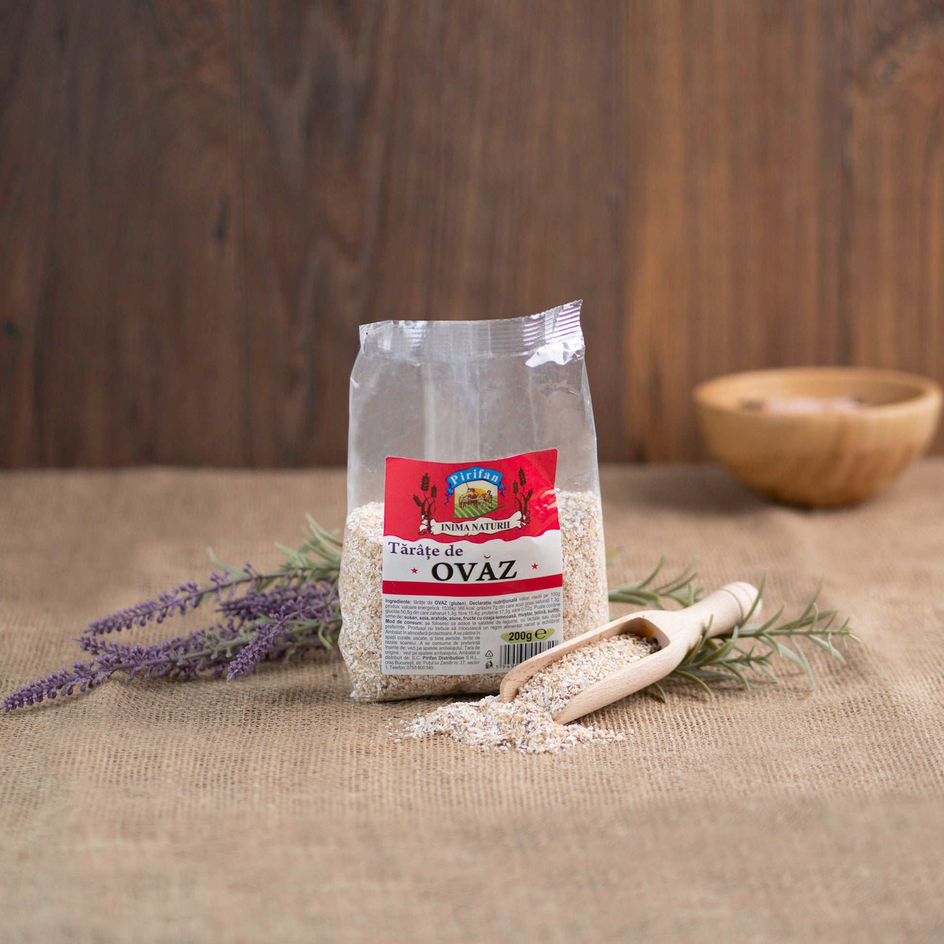 Beneficii: Taratele de ovaz, datorita fosforului si a magneziului din compozitia lor, ajuta la formarea si mentinerea oaselor sanatoase si a dintilor si la functionarea in parametrii normali a sistemului imunitar. Taratele de ovaz Pirifan, indiferent de reteta in care sunt integrate, contribuie in mod esential la reducerea concentratiei de grasimi din sange, fiind astfel ideale in orice cura de slabit. Taratele de ovaz sunt recomandate celor care sufera de boli cardiovasculare sau hipertensiune arteriala, datorita faptului ca reduc concentratia de colesterol din sange. De asemenea, taratele de ovaz Pirifan actioneaza ca un laxativ natural, facilitand digestia si ajutand la detoxifierea organismului.