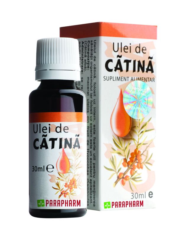 | Contribuie | Uleiul de catina este recunoscut pentru efectul sau profilactic in mentinerea sanatatii, iar utilizat extern este un excelent epitelizant al ranilor. Utilizare Pentru prevenirea infectiilor si mentinerea sanatatii, mai ales primavara si in perioadele de convalescenta; extern se utilizeaza pentru tratamentul pielii afectate de radiatii solare sau raze X precum si vindecarea diferitelor rani. |
