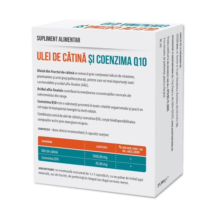 | Ingrediente | DOZA ZILNICA RECOMANDATA (3 capsule) CONTINE Ulei de catina 1500,00 mg Coenzima Q10 45,00 mg |