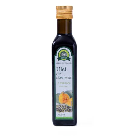 100% ulei pur de dovleac (bostan) presat la rece, din seminte de dovleac uscate natural, netratate termic, atent selectionate, foarte bogat in vitamine (E, A, C, D, K) si minerale (fosfor, magneziu, cupru, zinc, calciu, fier, protide si enzime).