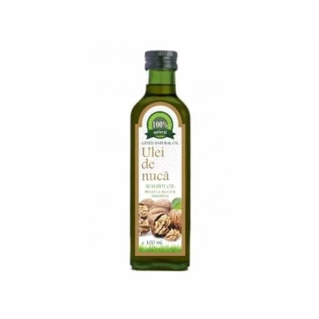 - 100% ulei natural de nucă presat la rece din miez de nucă uscată natural, netratat termic, foarte bogat în vitamina A, B1, B3, B5, B6, C, D, E, K, precum şi minerale: cupru, magneziu, calciu, fosfor, potasiu, fier, acizi graşi, omega 3 şi omega 6. Acizi graşi polinesaturaţi totali 63,3g, din care: acid linoleic (omega 6) -52,9 g şi acid alfa-linoleic 10,4g.