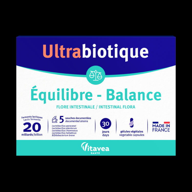 Ultrabiotique Équilibre combina cinci tulpini de fermenti lactici pentru a pastra echilibrul florei intestinale.