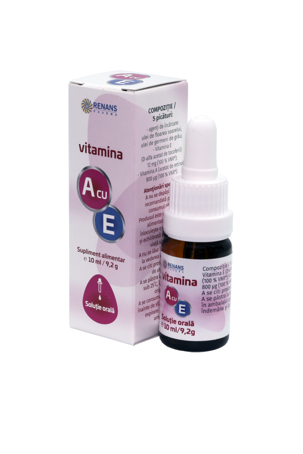 5 picaturi soluţie conţin Vitamina E (D – alfa acetat de tocoferil) 12 mg (100 % VNR*) şi Vitamina A (acetat de retinol) 800 µg (100 % VNR*).