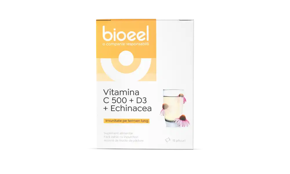 Ingrediente active: Vitamina C (acid ascorbic) 500 mg (625% VNR*), extract uscat din parti aeriene de Echinacea (Echinacea purpurea (L.) Moench), Vitamina D3/colecalciferol 0,25% furnizand 5 µg de Vitamina D3- 2 mg (200 UI, 100% VNR*)