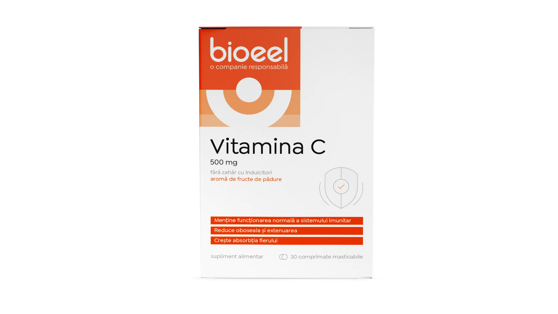Vitamina C (acid ascorbic) 500 mg (625% VNR*),ingrediante inactive: indulcitori: sorbitol, aspartam, zaharina si sucraloza, agenti antiaglomeranati: talc, acid stearic, dioxid de siliciu coloidal, aromatizant: aroma de fructe de padure.