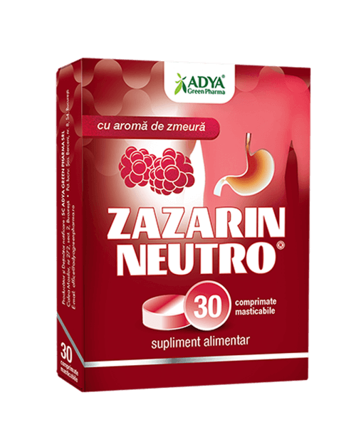 Zazarin Neutro este un supliment alimentar marca Adya Green Pharma din categoria produselor antiacide, insa cu o formula extinsa care include plante medicinale si hialuronat de sodiu, formula care permite si o actiune mai complexa prin efectele emoliente si cicatrizante.